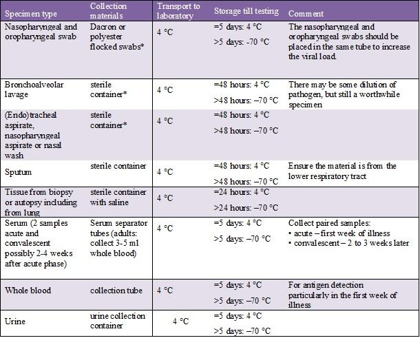 WHO suggests that people who have acute respiratory diseases such as cough, fever, respiratory tract infection and have been to Wuhan within 14 days or have been exposed to contact with other patients should be comprehensively tested. On 17 January 2020, WHO released the “Laboratory testing for 2019 novel coronavirus (2019-nCoV) in suspected human cases, Interim guidance, 17 January 2020”. The guidance points out that the specimens to be collected from symptomatic patients include respiratory specimens (nasopharynx and oropharyngeal swabs, sputum, bronchoalveolar lavage, etc.) and serum specimens, as follows:
