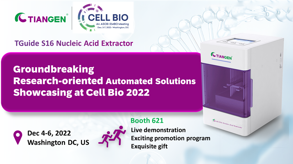 From December 4 to 6, in Washington, DC, US, TIANGEN will participate and exhibit at Cell Bio 2022, the joint meeting of the American Society for Cell Biology (ASCB) and European Molecular Biology Organization (EMBO), where we will bring the groundbreaking research-oriented automated solution, TGuide S16 Nucleic Acid Extractor at Booth 621.