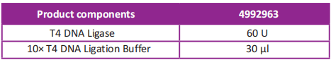 ● ATP is included in 10× T4 DNA Ligation Buffer. To avoid the degradation of ATP, 10× T4 DNA Ligation Buffer is recommended to be distributed in small packages and stored at -30~-15°C.