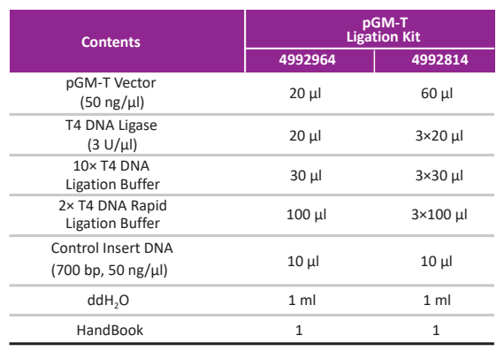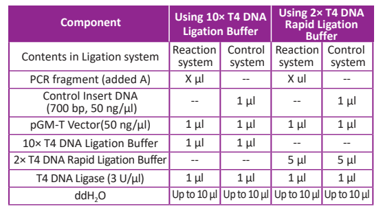 Note: There are two kinds of buffer in the kit, 10× T4 DNA Ligation Buffer and 2× T4 DNA Rapid Ligation Buffer. Don’t add two buffers in one tube.