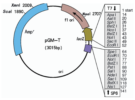 The pGM-T Vectors are linearized vectors with a single 3´-terminal thymidine at both ends. The T-over hangs at the insertion site greatly improve the efficiency of ligation of PCR products by preventing