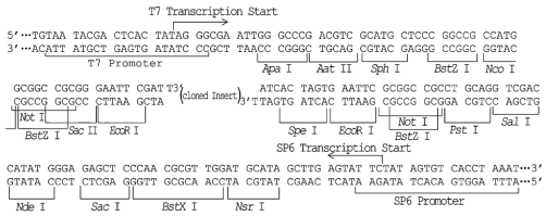 The pGM-T Vectors are high-copy-number vectors containing T7 and SP6 RNA polymerase promoters flanking a multiple cloning region within the α-peptide coding region of the enzyme β-galactosidase. Insertional inactivation of the α-peptide allows identification of recombinants by blue/white screening on indicator plates.