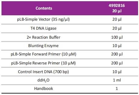 The kit features a novel positive selection cloning vector pLB-Simpl evector. This vector contains a lethal gene which would be disrupted by the insertion of a DNA fragment into the cloning site. As a result, only cells with recombinant plasmids are able to propagate, cyclized empty pLB-Simple vector will express lethal toxic protein which will kill the E. coli cells. This cloning method eliminates the need of expensive blue/whitescreening and accelerates the process of cloning and selection.