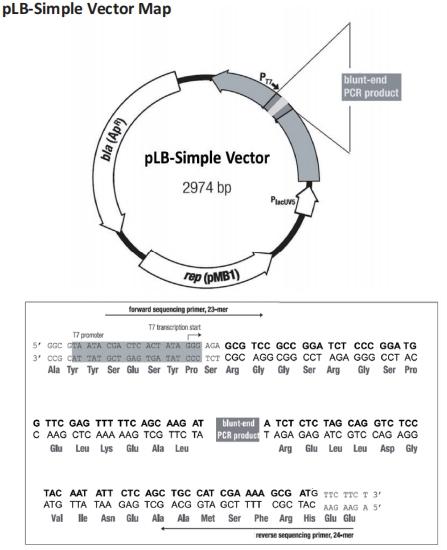 The kit features a novel positive selection cloning vector pLB-Simpl evector. This vector contains a lethal gene which would be disrupted by the insertion of a DNA fragment into the cloning site. As a result, only cells with recombinant plasmids are able to propagate, cyclized empty pLB-Simple vector will express lethal toxic protein which will kill the E. coli cells. This cloning method eliminates the need of expensive blue/whitescreening and accelerates the process of cloning and selection.
