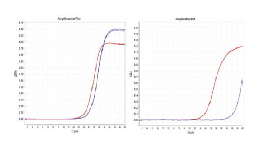 Figure. 1. Reverse transcription of human miRNA mimic mix with TIANGEN miRcute Plus miRNA First-Strand cDNA Kit and similar products of Supplier Q (left) Supplier T (right), respectively. The hsa-miR-133a-3p was detected by real time PCR. The results show that for the same RNA sample, the amount of cDNA obtained after reverse transcription of TIANGEN miRcute Plus miRNA First-Strand cDNA Kit (red line) is larger than that of other Suppliers (blue line), indicating higher RT efficiency.