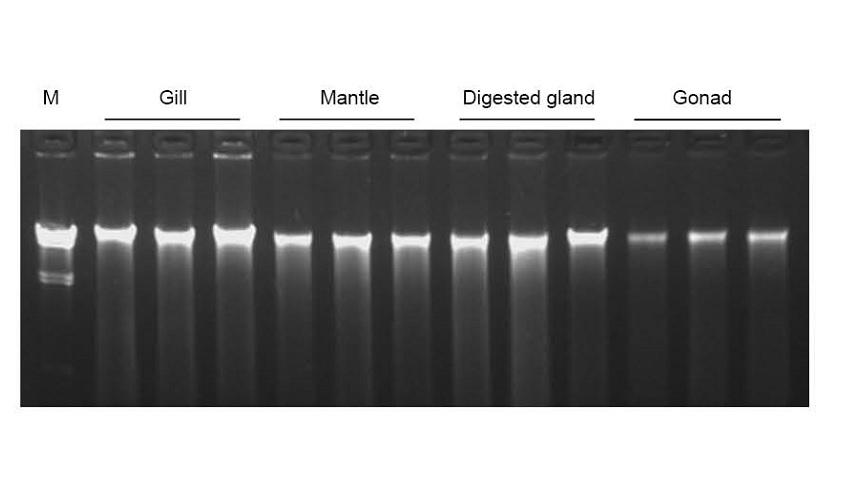 Patinopecten yessoensis genomic DNA extraction by TIANamp Marine Animals DNA Kit Starting amount: 20 mg gill; 30 mg other parts. 3 μl of 100 μl eluates were loaded per lane.