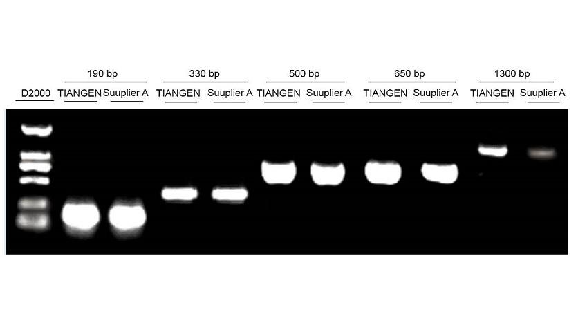 The genomic DNA extracted by TIANamp FFPE DNA Kit and relevant product from Supplier A were amplified to 190 bp, 330 bp, 500 bp, 650 bp and 1300 bp fragments. The result shows that DNA extracted by TIANamp FFPE DNA Kit has higher yield, higher purity especially for large fragments.