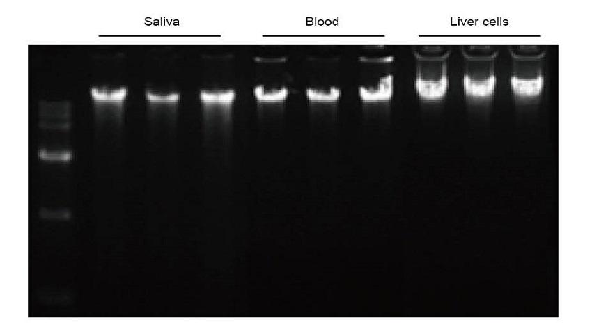 Use Magnetic Universal Genomic DNA Kit to purify DNA from saliva, blood and liver cells according to the instructions. M: TIANGEN Marker D15000.