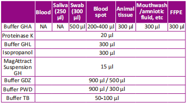 ● Self-provided reagents: Isopropanol, ethanol. For tissue samples, 1M DTT should be prepared. For bacteria samples, 1M NaOH should be prepared. If RNA residues need to be removed, RNase A (100 mg/ml) solution should be prepared. For FFPE samples, please purchase environmentally friendly deparaffinization oil DPR. To extract large volumes of blood and blood clots, please purchase Buffer CLA and Buffer GHL separately.