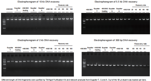 Different length of DNA fragments were purified by TIANgel Purification Kit and relevant products from Supplier T, Q and A. 3 μl of the 50 μl eluent was loaded per lane.