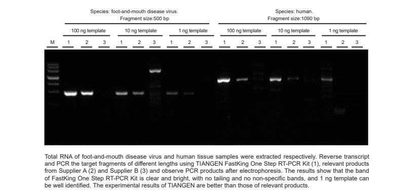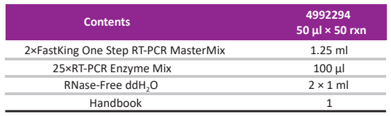 FastKing One Step RT-PCR Kit allows both reverse transcription and gene amplification to take place in a single tube, which avoids cross contamination between samples and improves the sensitivity of detection. The 25× RT-PCR Enzyme Mix contains King reverse transcriptase, which is a high efficient reverse transcriptase expressed by engineering bacteria; a further-modified hot start Taq DNA polymerase, which provides high efficiency and accuracy for the amplify reaction; and RNase inhibitor. With a special modified hydrophobic motif, King RTase gets a significant affinity for RNA and facilitates transcription through of RNA templates, especially for templates with high GC content or complex secondary structures. The 2× FastKing One Step RT-PCR MasterMix contains appropriate ion concentration, dNTPs and PCR enhancer. It could stabilize both RTase and polymerases and keep their efficiency within the whole reaction process.