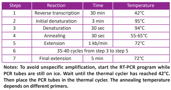 It is suitable for detecting gene expression level in cells and tissues, cloning cDNA of specific genes and detecting RNA virus. It is especially suitable for qualitative detection of low abundance templates. -