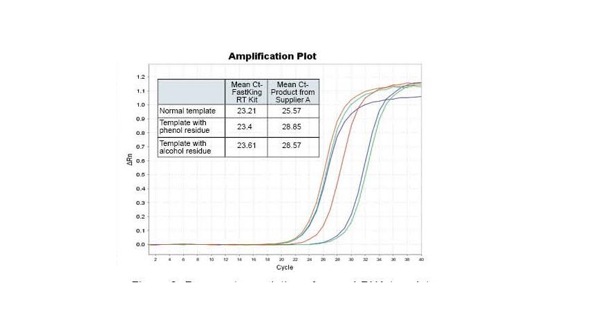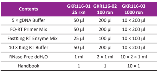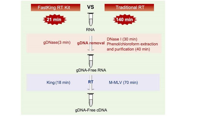 FastKing RT kit is an efficient, rapid and genomic DNA cleaning up reverse transcription system. This product contains gDNase which can remove genomic DNA by incubation at 42°C, 3 min to protect the total RNA from genomic DNA interference. King RT Enzyme in RT Enzyme Mix provides a high-efficient reverse transcription with 42°C, 15 min. With a special modified hydrophobic motif, King RTase gets a significant affinity for RNA and facilitates transcription through of RNA templates, and enables read-through of templates with high GC content or complex secondary structures.