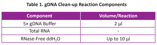 ● Prepare a fresh master mix to clean up genomic DNA according to Table 1. Mix thoroughly and carefully for no more than 5 sec. Centrifuge briefly to collect residual liquid from the sides of the tube, incubate the mixture for 3 min at 42°C then store on ice.