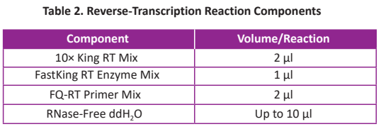 ● Thaw template RNA on ice. Thaw 5× gDNA Buffer, FQ-RT Primer Mix, 10× King RT Buffer, RNase-Free ddH2O at room temperature (15-30°C). Place on ice immediately after thawing. Mix each solution by vortex, and centrifuge briefly to collect residual liquid from the sides of the tubes.