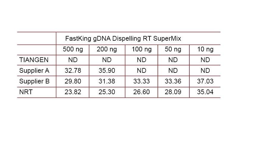 Experimental example 1. cDNA was synthesized using one-step reverse quantitative reagents of TIANGEN FastKing gDNA Dispelling RT SuperMix, relevant products from Supplier A and Supplier B respectively. Detect the RN5 gene of mice using TIANGEN Talent qPCR PreMix (SYBR Green), and the amplification curve, melting curve and standard curve were analyzed. The results show that TIANGEN FastKing gDNA Dispelling RT SuperMix has the highest quantitative Ct value after reverse transcription and excellent stress resistance, and has obvious advantages for templates with high impurity residues.