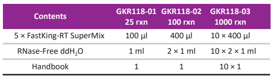 ● Thaw RNA template on ice. Thaw 5× FastKing-RT Super Mix and RNase-Free ddH2O at room temperature (15-30°C), and then place them on ice immediately after thawing. Mix each solution by vortex, and centrifuge briefly to collect residual liquid from the sides of the tubes.