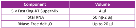 Synthesize first-strand cDNA with FastKing gDNA Dispelling RT Super Mix, this protocol is optimized for the setup of a 20 µl reaction with the RNA template amount range from 50 ng to 2 μg.