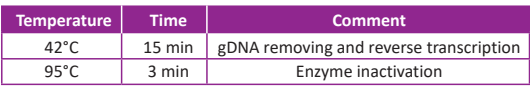 ● Short reaction time: gDNA can be removed and cDNA be synthesized together in one step within 15 min at 42°C.