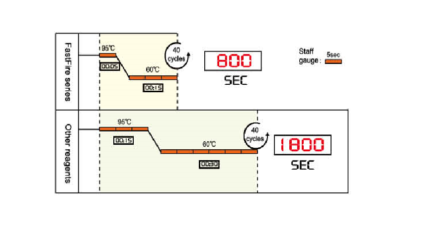 ● FastFire qPCR PreMix employs a specific antibody-modified hot-start DNA polymerase in conjunction with a carefully optimized Buffer system, resulting in a 60% shorter PCR reaction time than typical qPCRs and featuring accurate quantitation, high amplification efficiency, reproducibility, and a wide confidence range.