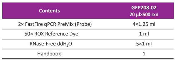 FastFire qPCR PreMix (Probe) can be stored at -30~-15°C for one year. It should be stored immediately upon receipt at -30~-15°C. 2× FastFire qPCR PreMix (Probe) and 50× ROX Reference Dye should be thawed and then mixed upside down gently to be homogenous before using. If the Reagents have been thawed but not used, it is important to thoroughly mix prior to re-freezing. (The layering of salts during the thawing process and subsequent crystallization during freezing will damage the enzyme and decrease product performance.) The reagents could be stored for up to 3 months at 2-8°C if frequently used. Please avoid refreezing and thawing repeatedly.