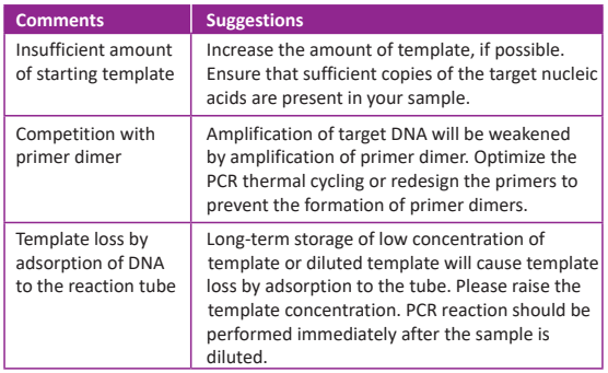 ● In a 20 µl reaction volume, the amounts of genome DNA or cDNA template is usually less than 100 ng. The reverse transcription product, if used as template, should not comprise more than 20% of the total PCR reaction volume.