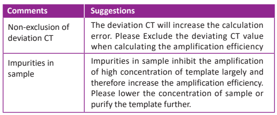● Amplification efficiency less than 90% (slope < -3.6).