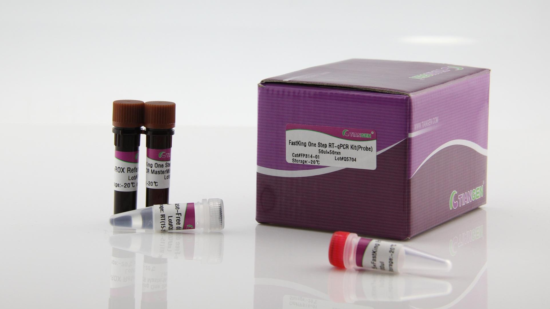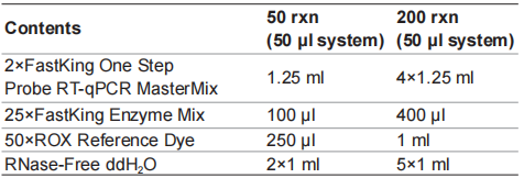 This product is a special reagent for one-step RT-qPCR using probe method (TaqMan, Molecular Beacon, etc.). The Real Time One Step RT-qPCR reaction can be continuously carried out in the same reaction tube using the product. The operation is simple. The cross contamination between samples can be avoided and the detection sensitivity is improved. The kit adopts a premix of TIANGEN novel reverse transcriptase (King RTase), novel antibody modified hot start Taq DNA polymerase and RNase Inhibitor, and has stronger RNA affinity, thermal stability, higher amplification efficiency and specificity. In addition, the 2× FastKing One Step Probe RT-qPCR MasterMix in this product is a new type of reaction system specially optimized for the abovetwo key enzymes. It contains necessary ionic components, dNTPs, PCR stabilizers and enhancers, which can ensure the best performance of King RTase and the new type of hot start Taq DNA polymerase in the whole one-step reaction process.