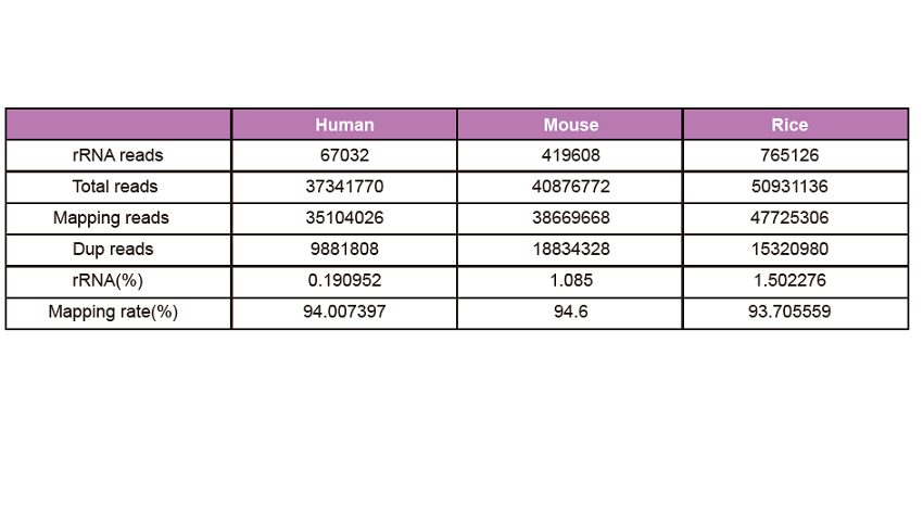 Table 1. Using TIANSeq mRNA capture Kit to capture the mRNA in the total RNA of human, mouse and rice with the input amount of 500 ng. RNA-Seq library was constructed by TIANSeq Fast RNA Library Kit (illumina), and the sequencing data analysis showed that the rRNA residue of the three types of samples were less than 2%,