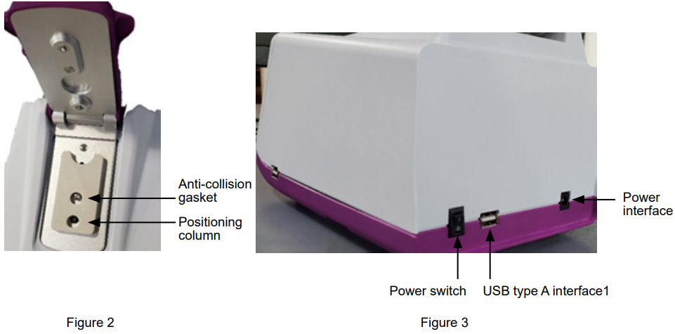 Before turning on the power switch of the instrument, open the upper arm to take away the anti-collision gasket, and then lower the upper arm gently, as shown in Figure 2. This anti-collision gasket is to prevent the upper arm from colliding with the positioning column during the movement of the instrument. After use of the instrument, it is recommended to put the anti-collision gasket back to the position shown in Figure 2.