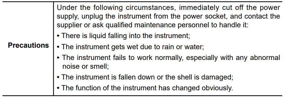 The instrument should use the supplied power cord. If the power cord is broken, it must be replaced. Do not repair it by yourself. It shall be replaced with a power cord of the same type and specification. When the instrument is in use, do not place anything on the power cord and do not place the power cord in a place where people flow.