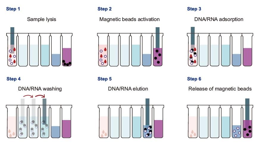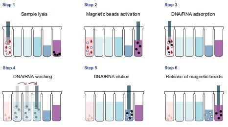 After the sample is lysed by the lysis buffer, the nucleic acid dissociated from the lysis/binding solution is specifically bond by the magnetic beads. Through the cooperation of the magnetic rod and the magnetic tip comb, the magnetic binding, transfer, release, mixing and other actions are completed to separate the magnetic beads binding the nucleic acid from the lysis/binding solution. Various impurities that are not specifically bond to the magnetic beads are removed in the washing well, and finally the nucleic acid molecules are dissolved in the elution buffer.