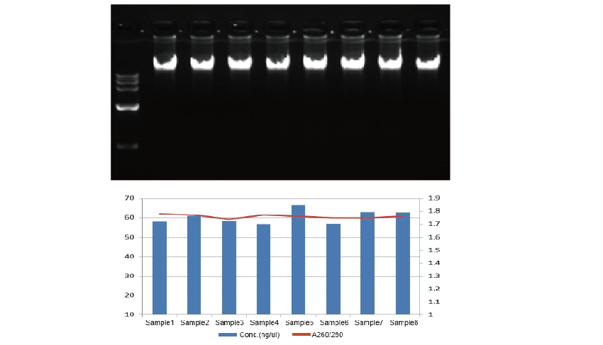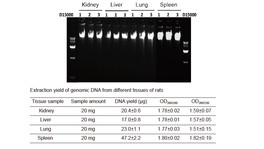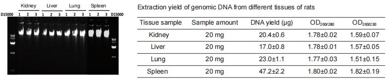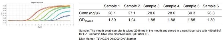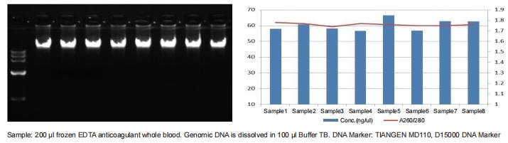 Sample: 200 μl frozen EDTA anticoagulant whole blood. Genomic DNA is dissolved in 100 μl Buffer TB. DNA Marker: TIANGEN MD110, D15000 DNA Marker