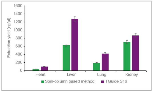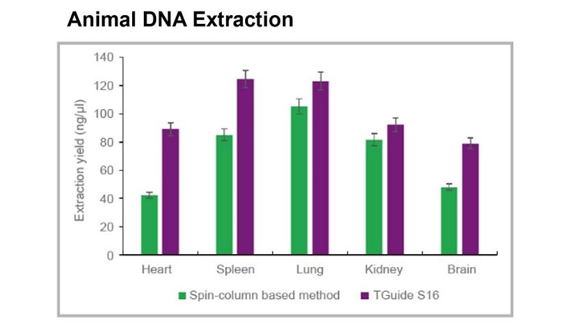 Experiment result: the animal tissue total RNA automatically extracted by TGuide S16 equipped with reagent TGuide Smart Blood/Cell/Tissue RNA Kit (GDP661) has high yield and purity, which is equivalent to the RNA extracted by the spin-column based extraction protocol. The purity is approximately the same, with OD260/OD280 around 2.0-2.1 and OD260/OD230 > 2.0. In conclusion, TGuide S16 can be used to extract the total RNA from animal tissues in replacement of spin-column based extraction protocol.