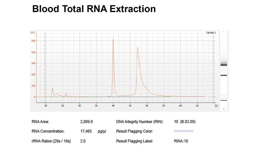 The samples in the above table were taken in the recommended amounts according to the protocol. Using the TIANGEN Magnetic Hi-Tissue/Cell Total RNA Kit(GDP671), and the total RNA was extracted by the automated nucleic acid extractor. Elution by 100 μl and load 5 μl by electrophoresis.