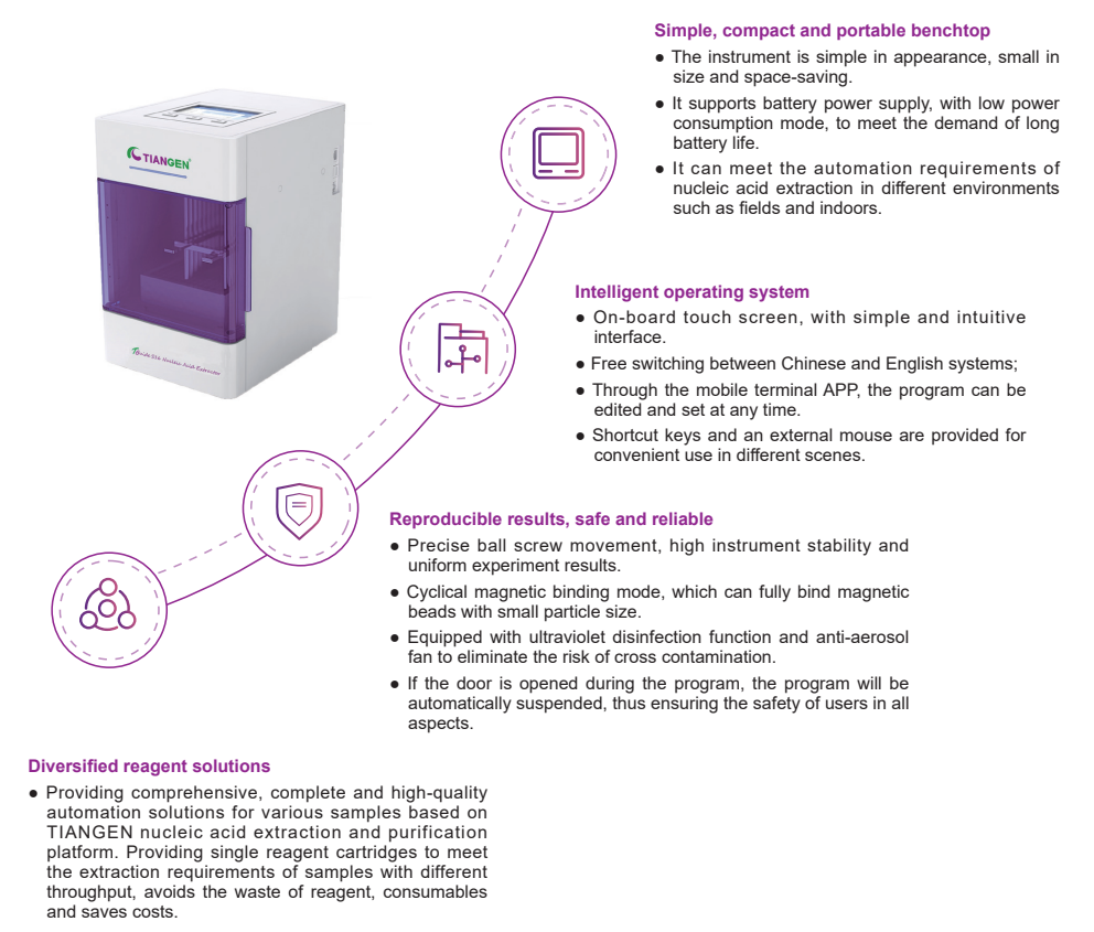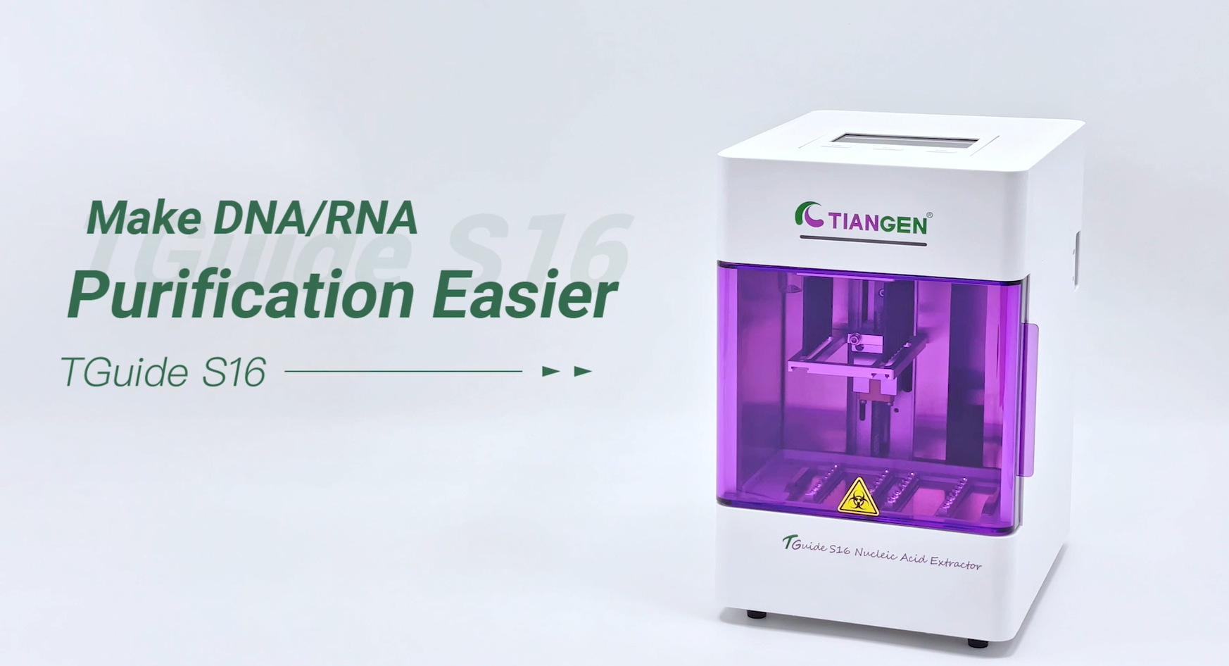 TGuide S16 Nucleic Acid Extractor can process 1~8 or up to 16 samples simultaneously by the magnetic rods to bind and transfer the magnetic beads, the 96-well plate or single-sample reagent cartridge and magnetic tip comb. TGuide S16 is an affordable choice for academic or industrial labs to extract nucleic acid automatically from various sample types, including animal and plant tissue, blood, virus, PCR product, agarose gel, etc.