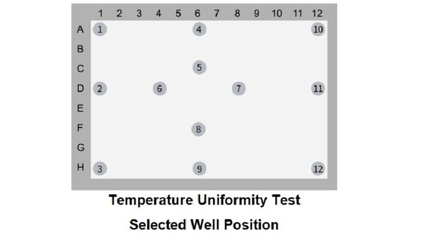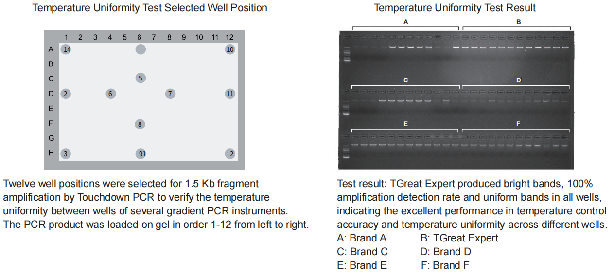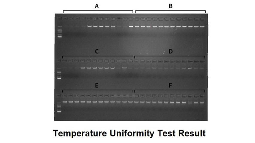 12 well positions were selected for 1.5 Kb fragment amplification by Touchdown PCR to verify the temperature uniformity between wells of several gradient PCR instruments. The PCR product was loaded on gel in order 1-12 from left to right (Figure 2).