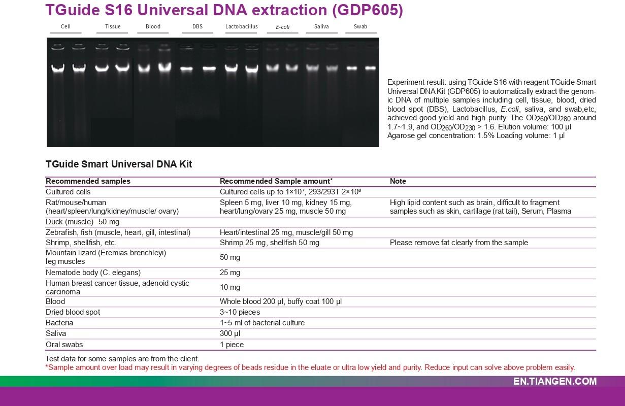 ● Simple and fast: Ultra-pure total DNA can be obtained by running TGuide S16 within 1 hr.