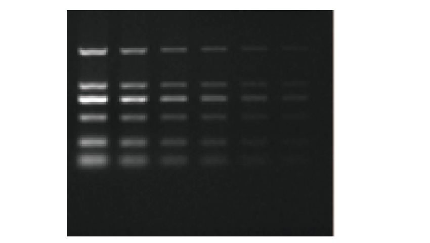 D2000 samples (100 ng, 50 ng, 25 ng, 12.5 ng, 6.25 ng, 3.125 ng) were used for the comparison of dyes (EB, GeneRed). Run in 1% agarose gel, 160V, 25min
