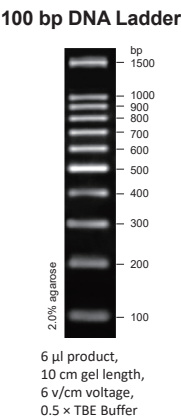 The 100 bp DNA Ladder marker consists of eleven double-stranded DNA bands that are suitable as molecular weight standards for agarose gel electrophoresis.