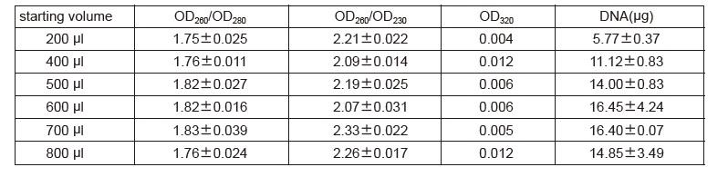 The genomic DNA was extracted from different volumes of human whole blood samples by TIANamp Blood DNA Kit. The results are as follow. The results are listed as reference only, the actual extraction results depends on the conditions of samples.